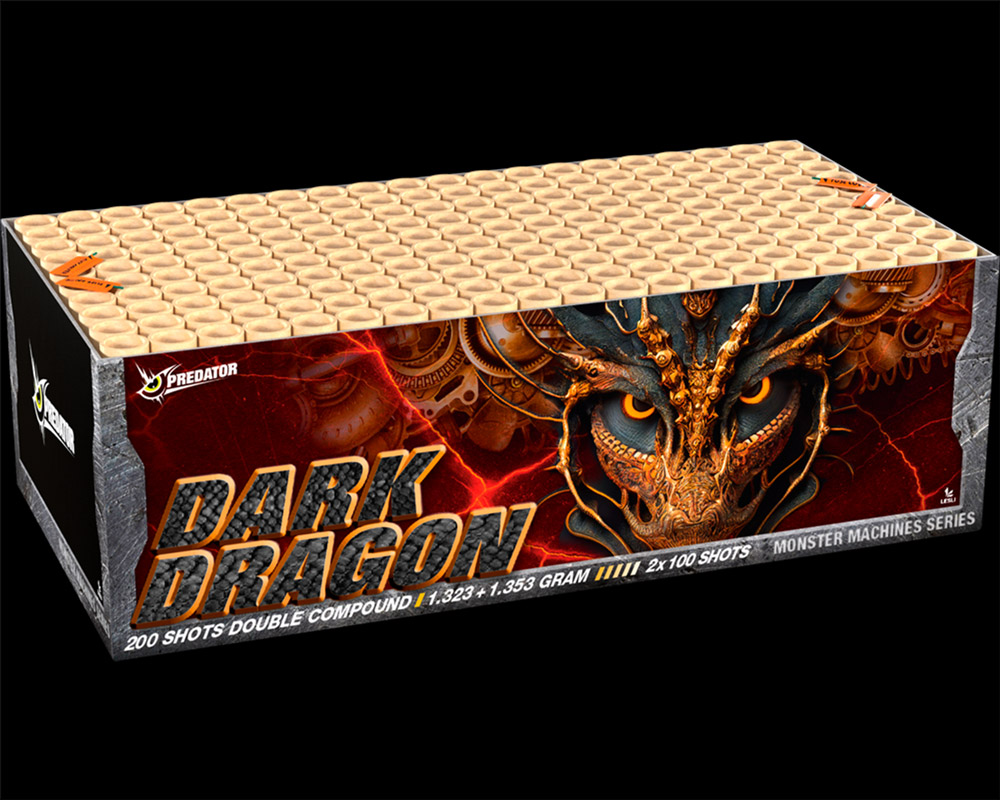 Mit einer spektakulären Abfolge aus 200 Schüssen entfaltet der Doppelverbund Dark Dragon über eine Brenndauer von 147 Sekunden hinweg eine Show, die den Himmel in ein wahres Farbenmeer taucht. Die Salven zünden in schnellen Abfolgen und kombinieren neueste Effekte, leuchtende Farben und außergewöhnliche Kombinationen, die den Zuschauer in ihren Bann ziehen.