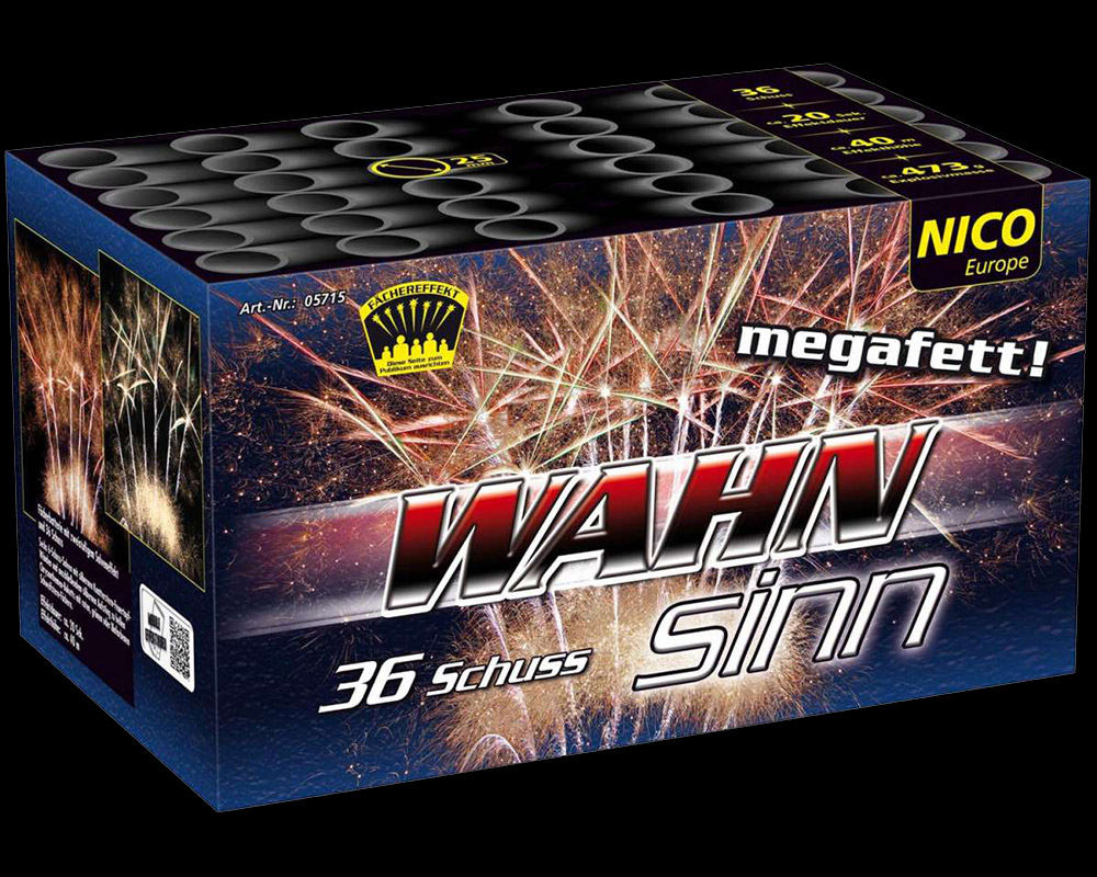 6 weit aufgefächerte 6er-Salven mit silbernen Knatterstern-Feuertopf-Wänden in der unteren Ebene und anschließendem silbernen Aufstieg zu riesigen, hellen Knatterstern-Buketts mit satter Zerlegung und roten, grünen oder lilanen Schweifstern-Fächern füllen den Himmel komplett aus. Nur das Grinsen beim Anschauen ist noch größer!